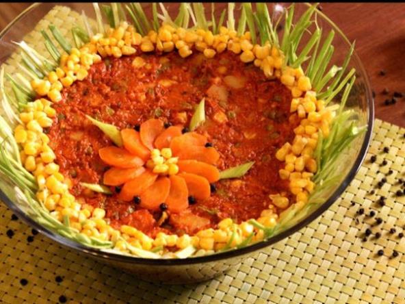 Ohlađeno povrće (krompir, šargarepu), iseckati na kockice i staviti u činiju, dodati grašak, kukuruz i ajvar. Sve dobro promešati i dekorisati po želji. U salatu možete staviti tunjevinu i postan majonez, a ako ne postite iseckanu salamu, kulen, sir trapist...