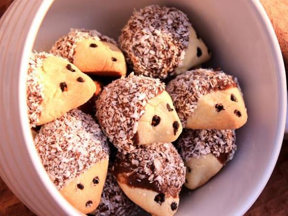 Pečene ostaviti da se malo prohlade, umočiti jedan kraj u čokoladu i zatim u kokosovo brašno. Čačkalicom iscrtati oči i njuškicu.