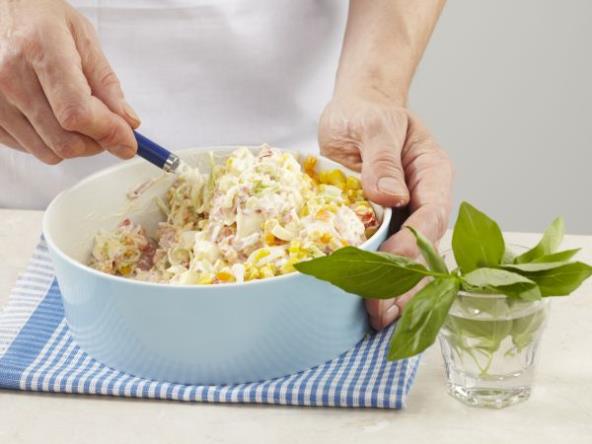 Kukuruz obariti. Praziluk i šunku iseckati sitno i pomešati sa ohlađenim kukuruzom. Dodati majonez, pavlaku i so i sve dobro izmešati.