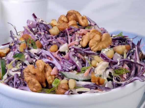 U posebnu posudu pomešajte jogurt, senf, ulje, so. Prelijte salatu i promešajte.
