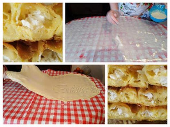 Na sto staviti stolnjak posuti ga malo brašnom, staviti testo na sto i krenuti da ga razvlačite najpre od sredine prema krajevima, dokle se god može tanje. Krajeve testa iseći ili pokidati rukama a razvijenu koru malo pouljiti.
