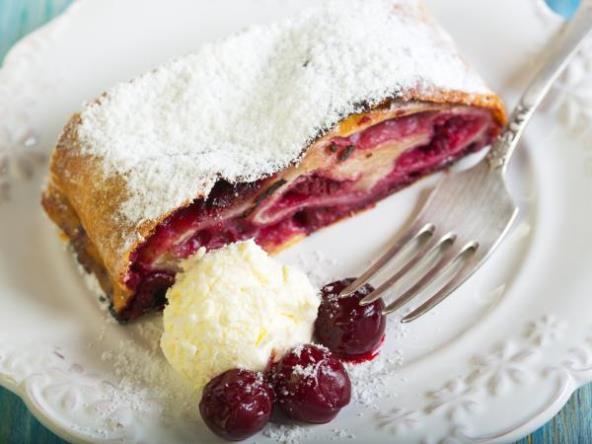 Preko rasporediti trećinu višanja, a zatim ponoviti postupak sa korama - staviti 4 kore i između mazati fil, pa opet stavljati višnje (posle svake četvrte kore). Završiti korama, premazati preostalim filom, izbuštiti nožem i staviti da se peče dok ne porumeni, oko 20 - 30 minuta.
