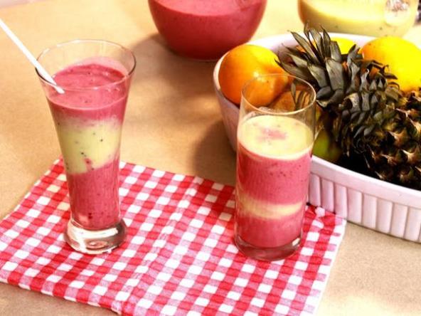 Banane oguliti i staviti zajedno sa malinama u jednu dublju posudu. Izmiksati da postane kaša i naliti jogurt. Još malo izmiksati. Tako uraditi i sa zelenim delom.