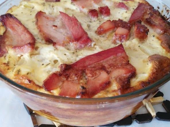 U činiju razbiti jaja, dodati pavlaku, mleko i instant pečurke koje razmutimo u malo mlake vode pa pomešamo sa pavlakom. Sve to prelijemo preko krompira i ako želite poređate suvu slaninu.