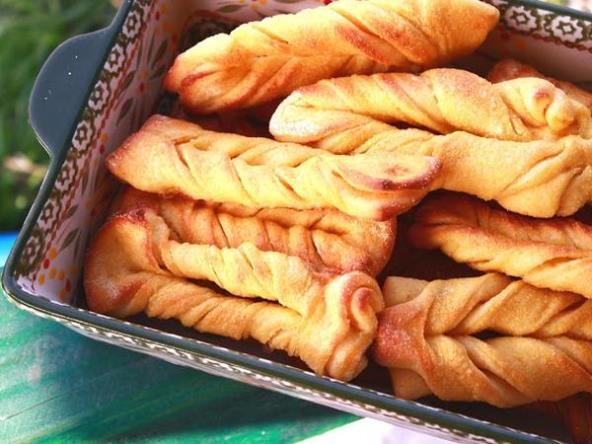 Na radnu površinu posuti palentu i izručiti premešeno testo. Razvući oklagijom, na polovinu testa premazati omekšali maslac, preklopiti drugom polovinom i utapkati prstima ivice. Razvući tek malo da se dobije jednak oblik, iseći tri do četiri trake, i svaku traku na manje delove.