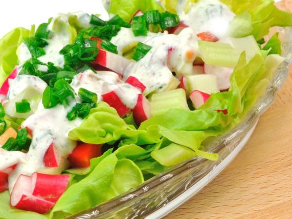 1. Iseskajte sremus, rotkvice i mladi luk. Zelenu salatu isecite na krupnije. Pomešajte sastojke, stavite malo ulja i so.