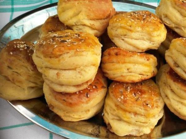 Pokriti 10 min da odmori pa razviti oko 1,5 sm debljine i vaditi pogačice i ređati u pleh namazati sa razmućenim jajetom i posuti susamom i kimom.