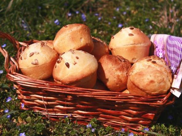 Potom promešati i kašikom puniti namazane kalupe za mafine. Odozgo posuti semenom suncokreta, ostaviti da nadođe i peći na 220 stepeni.