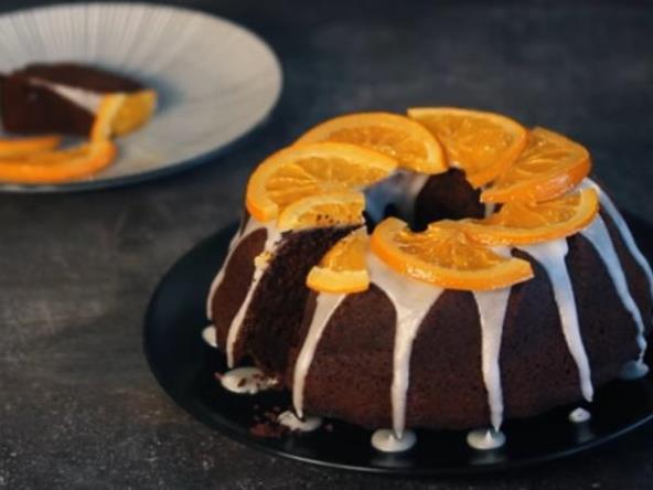 Hladan kuglof prelijte glazurom, sačekajte da se malo stegne a onda gore postavite polovine kolutova kandiranih pomorandži. Pri serviranju možete ukrasiti sa po kojim listićem nane.