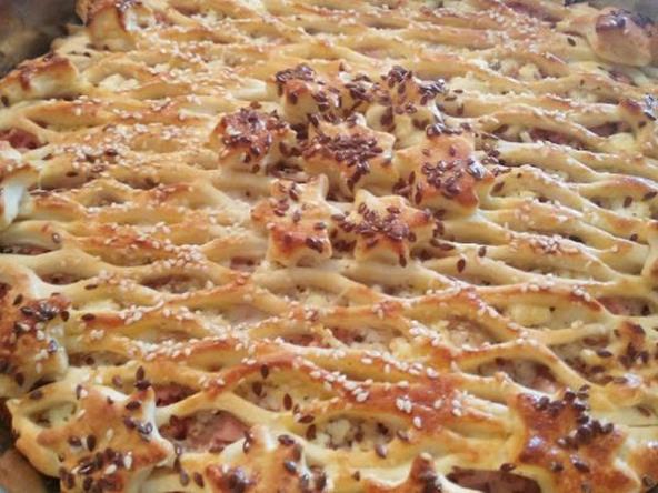 Prvi deo razviti oklagijom tanko testo veličine pleha. Namazati kečapom, posuti seckanom šunkom, zatim namrvljenim tvrđim sirom, i rendanim kačkavaljem i origanom.