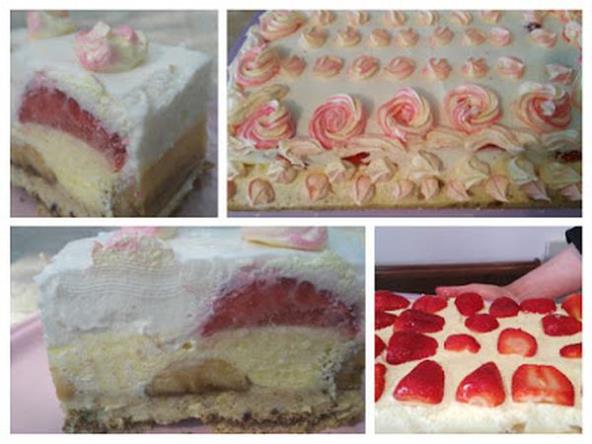 Poređajte keks (suv) na dno poslužavnika pa premažite prvi fila sa orasima. Dodajte banane po dužiti presečene, pa odozgo kremu pudinga, pa jagode. Preko toga šlag.