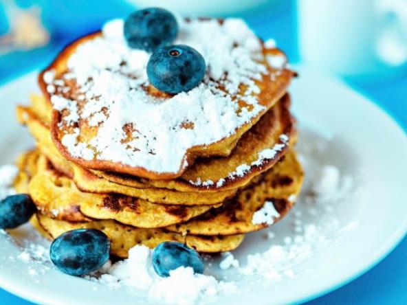 Koristite istu smesu kao i za klasične banana palačinke, a zatim dodajte borovnice u smesu pažljivo. Pecite dok smesa ne postane zlatno-braon boje. Pospite spremljene palačinke grčkim jogurtom i borovnicana.