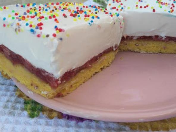 Vruć kolač reliti sa 50 ml. hladnog mleka sa jednom kašikom šećera. Ušpinujemo 200 gr šećera pa kad se ušpinuje dodati jagode i kuvati 5-7 min i u to ubaciti jedan puding od vanile skloniti sa šporeta malo prohladiti i sipati preko biskvita i lepo rasporediti.