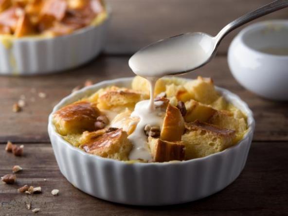 U posudi pomešajte jaja, mleko, šećer, cimet i vanilu dok se ne sjedine svi sastojci. Prelijte smesu preko hleba. Hleb izgnječite viljuškom tako da bude u potpunosti prekriven smesom. Kolač pecite u prethodno zagrejanoj rerni oko 45 minuta.