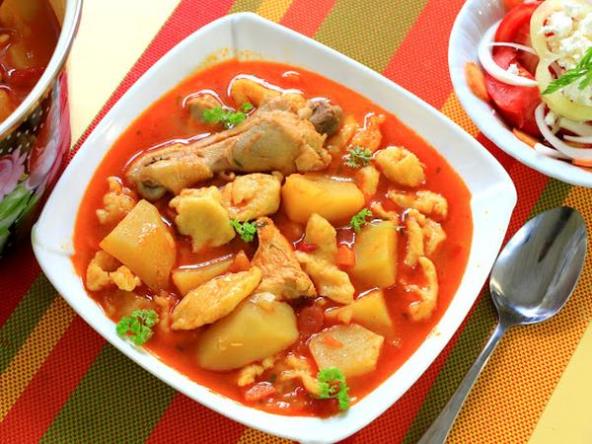 Potom ubacite i krompir, sitnu papriku, promešajte i prelite vodom. Kuvajte poklopljeno, na srednjoj temperaturi oko 30 minuta. Za to vreme napravite noklice. Umutite viljuškom jaje, izmešajte sa vodom, posolite i zgusnite s brašnom.