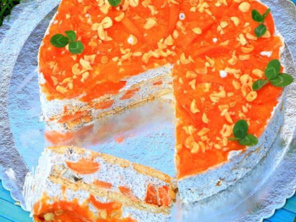 Umutiti slatku pavlaku, dodati šećer, mleko u prahu, mak i rastopljen želatin. Keks umakati u sok, slagati na kalup ili u tespsiju, potom premazati polovinu fila, naseckati kajsije, opet keks, fil, kajsije i odozgo preliti sa prelivom koji se pravi na sledeći način.
