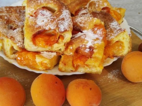 Umutiti jaja, dodati mleko i brašno, malo soli i umesiti testo malo gušće nego za klasične palačinke. Pleh namazati uljem pa ga staviti u zagrejanu rernu. Sipati u tepsiju, zatim poređati voće (kajsije).