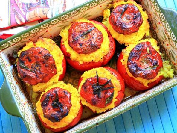 Paradajz operite, odrežite vrh, izdubite i napunite pirinčem. Poklopite svaki gornjim delom paradajza, pospite malo biberom, začinom, uljem i pecite u zagrejanoj rerni na 220 stepeni oko 40 minuta.