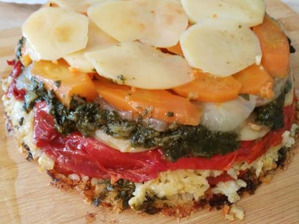 U đuvečaru staviti pek papir na dno pa poređati krompir iseckan na kolutove, a zatim ređati ostalo povrće po redu. Svako povrće posloliti i dodati malo ulja. Na pirinač staviti rendanog kačkavalja. Peći na 200 stepeni oko 40 min.