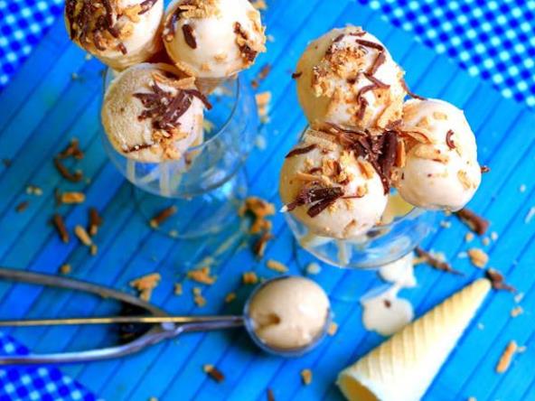 Poslužite u činijicama, kornetu, na palačinki, uz voćni kolač...preliveno, nepreliveno..svakako je odličan. Uživajte ovog leta u odličnom domaćem sladoledu.