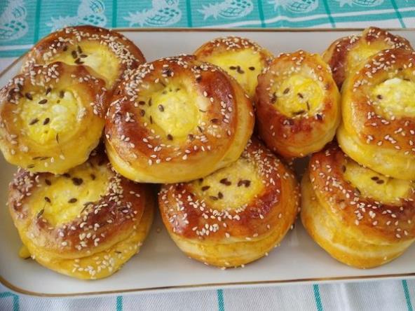 Narasle margarite pritisnuti u sredini i napraviti udubljenje. Sir izdrobiti, dodati jaje i izmešati pa time puniti margarite. Namazati žumancetom i posuti susamom. Narasle margarite, peći na 180 stepeni oko 25 min. Služiti tople.