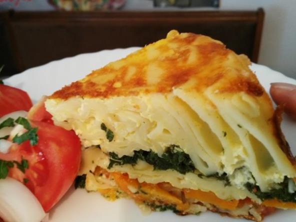Redosled možete biti po želji. Odozgo nanesite ostatkom fila, narendajte kačkavalj i pecite na 220 stepeni oko 30 minuta da se zapeče.