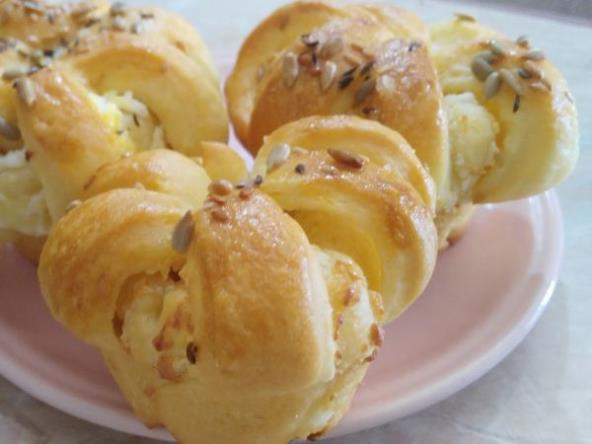 Donji deo iseći na trakice, a zatim uviti u rolnicu saviti i spojiti. Staviti u mafini kalupe. Ostaviti u kalupima da pecivo malo poraste, pa ga premazati žumancetom i posuti semenkama i krupnom solju. Peći na 200 stepeni C oko 30 min.