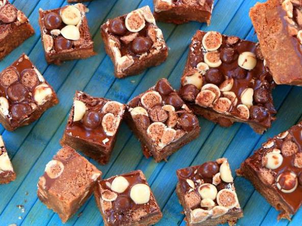 U poluohlađenu masu umešajte smoki, istresite u majni kalup ili formirajte na tacni. Prelijte otopljenom čokoladom i pospite čokoladnim smokijem koji možete po neki i prepoloviti.
