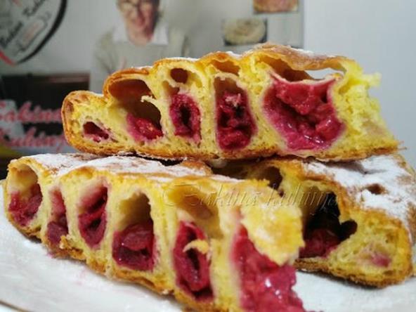 Umutiti jaja sa šećerom, dodati brašno sa praškom za pecivo, jogurt i ulje i sve lepo izjednačiti. Jednu koru sa dve kašike toga fila premazati i u dnu u red poređati višnje. Saviti krajeve i uviti i slagati male rolnice u okrugli pleh koji ste obložili pek papirom.