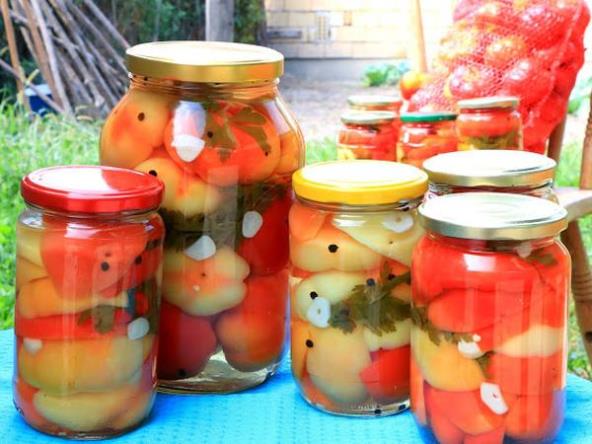 Paprike ređajte u tople tegle, ubacite u svaku, grančicu lišća i nekoliko listića belog luka. Nalijte vrelim sirupom, možete ih ovako ostaviti da upiju sirup pa još doliti da tečnost bude do vrha.