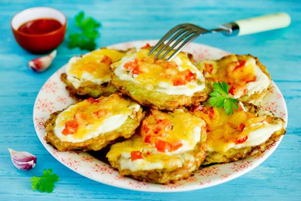 U veliki tiganj sipajte ulje da pokrijete dno. Stavite oko 1/4 šolje smese sa tikvicama na jednoj strani tiganja i oblikujte u mali kvadrat (možete spatulom da pritisnete da se spljošti). Ponovite postupak na drugoj strani tiganja. Pecite dok ne dobije zlatnu boju sa obe strane, oko 4 minuta po strani. Na jednu pljeskavicu stavite čedar i poklopite drugom pljeskavicom. Pecite još nekih 2 minuta da se sir istopi. Sklonite sa vatre i ostavite da se ocedi na ubrusu. Obrišite tiganj, pa ponovite postupak sa preostalim sastojcima. Servirajte odmah.