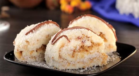 Otopite puter pa dodajte brašno, mešajte neprestano na laganoj vatri. Zatim postepeno dodajte mleko uz stalno mešanje. Dodajte šećer i vanilin šećer. Na plehu 30x40 koji je obložen pek papirom pospite kokosove pahuljice. Preko toga izručite prethodnu smesu, poravnajte pa pospite orasima. Stavite u frižider da se stegne 3h. Nakon toga uvijte smesu u rolat. Dobićete 2 koluta, jer ćete preseći smesu po širini. Prelijte otopljenom mlečnom čokoladom.