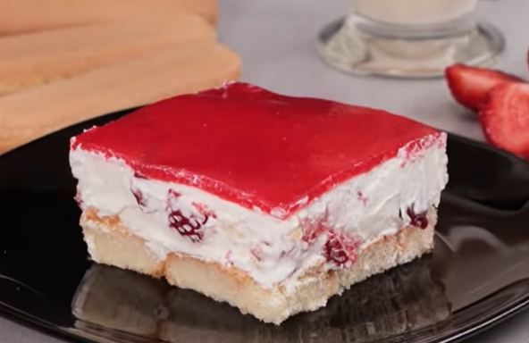 Umočite piškote u mleko i poređajte u pleh. Umutite slatku pavlaku sa šećerom (50 g) i dodajte seckane jagode (150 g), promešajte. Sipajte fil preko piškota i poravnajte. Stavite da se ohladi nekih pola sata.