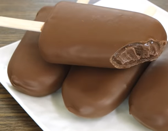 Otopite mlečnu čokoladu na pari. Ohladite na sobnoj temperaturi, pa sipajte u čašu. Stavite kalupe za sladoled u vodu sobne temperature nekih 45 sekundi, pa ih izvadite iz kalupa. Umočite sladoled u istopljenu čokoladu, izvadite i držite iznad čaše nekih 35-40 sekundi.