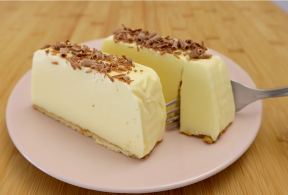 Sipajte smesu u posudu 12x20 cm obloženu pek papirom i stavite keks preko. Pokrijte providnom folijom i stavite u frižider na 3 sata. Okrenite i izvadite iz posude, pa pospite rendanom čokoladom.