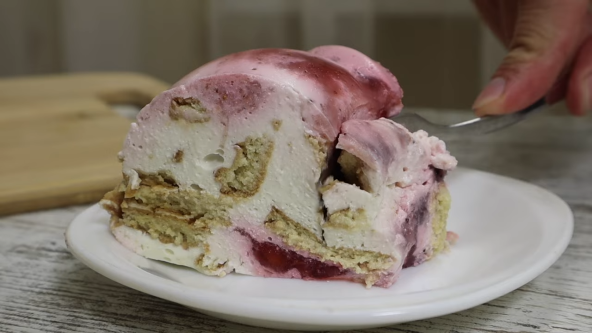 U dve posude sipajte želatin i preko toplu vodu. U jednu posudu 10 g, a u drugu 15 g. Pomešajte krem sir i jogurt i dobro sjedinite, a zatim maline u blenderu sameljite. U posudu sa 10 g želatina dodajte 2 kašike smese sa sirom i promešajte, pa sipajte u posudu sa sirom i dobro sjedinite. Isto uradite i sa malinama. Sipajte u podusu sa 15 g želatina 2 kašike izblendiranih malina, dobro promešajte, pa vratite u smesu sa malinama i sjedinite. Izdrobite keks u smesu sa sirom.