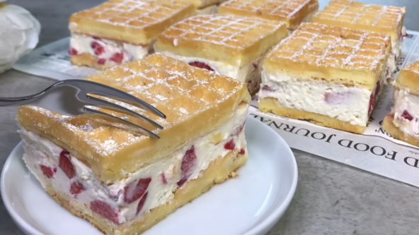 U pravougaonu tepsiju poređajte vafle, pa preko fil. Zatim još jedan red vafla i kolač je gotov. Ohladite u frižideru. Pre nego što poslužite pospite prah šećerom.