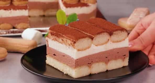 Maskarpone umutite sa šećerom u prahu i ektrakrom vanile, pa dodajte slatku pavlaku i sjedinite mikserom. Podelite na 2 jednaka dela, pa u jedan deo dodajte nutelu. Dobro sjedinite. Piškote umočene u mleko poređajte u pleh, pa preko sipajte čokoladni fil, stavite u frižider na sat vremena. Zatim sipajte beli fil, preko piškote i stavite na još sat vremena u frižider. Pospite kakao prahom preko.