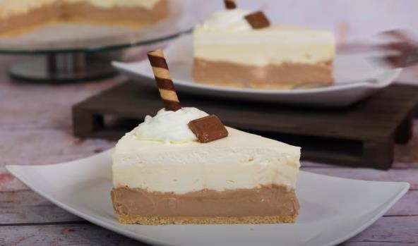 Izvaditi kalup iz frižidera. Na sloj keksa prvo staviti fil od mlečne čokolade i dobro ga zagladiti. Preko staviti fil od bele čokolade te i njega zagladiti. Zatim umutiti slatku pavlaku pa je naneti preko belog fila. Staviti tortu da se hladi barem 4 sata, najbolje preko noći.