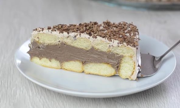 Okrugli kalup obložite providnom folijom i ređajte piškote umočene u mleko. Obložite i ivice, pa sipajte fil. Preko stavite još jedan red piškota, pa pokrijte providnom folijom i stavite u frižider, najbolje je preko noći. Izvadite tortu, pa umutite slatku pavlaku sa nutelom i premažite je celu. Pospite rendanom čokoladom i uživajte. Držite u frižideru do serviranja.