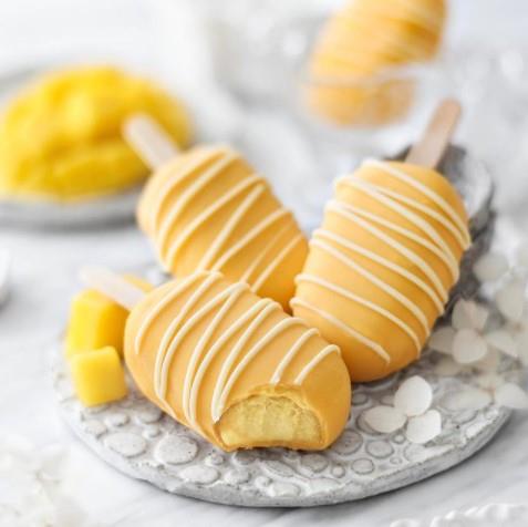 U blenderu umutite mango, koji ste prethodno iseckali na kockice, zatim dodajte slatku pavlaku i kondenzovano mleko i mutite dok ne postane glatko. Smešu sipajte u silikonske kalupe za sladoled. Belu čokoladu otopite i prelijte sladoled. Stavite štapiće i zamrznite dok se potpuno ne smrznu.