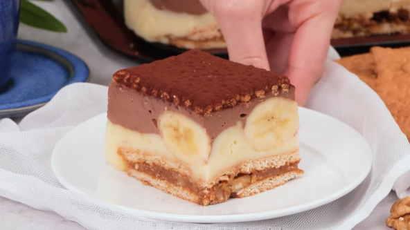 Za pripremu ovog kolača trebaju nam omiljene namirnice koje često koristimo u kolačima i koji im daju onaj fantastičan ukus. Preko keksa ide fila sa orasima, zatim čokoladni fil, pa fil od pudinga kao i banane. Osvežavajući kolač predivnog izgleda i zanimljive kombinacije ukusa.