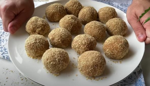Kuvano kondenzovano mleko pomešajte sa grčkim jogurtom i puterom pa umutite mikserom. Orahe i keks sameljite pa dodajte u prethodnu smeu. Sve lepo umešajte. Pravite kuglice i uvaljajte svaku u mlevene orahe ili keks. Stavite u frižider na 2 sata.