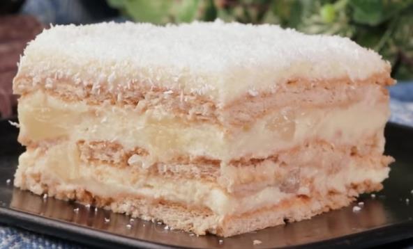Žumanca, šećer i malo mleka umutite. Zatim dodajte skrob i brašno pa sjedinite i sipajte preostalo mleko. Kuvajte dok se ne zgusne uz konstantno mešanje. Pokrijte i ohladite. Puter umutite, pa u njega dodajte ohlađenu smesu i sjedinite mikserom. Keks umočite u mleko ređajte u kalup, pa sipajte deo fila i preko seckani ananas. Ređajte tako dok sve ne utrošite, a poslednji sloj treba da bude fil. Pospite kokosom i ohladite nekih 2 sata u frižideru.