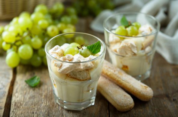 Operite grožđe i ohladite ga (dovoljno je 5-10 minuta u zamrzivaču). Slatku pavlaku umutite. Servirajte u čaši sa piškotama.