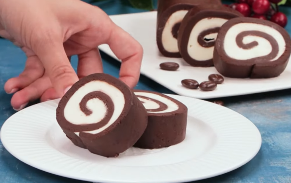 Sameljite keks i dodajte kakao i mleko. Sjedinite smesu, pa pokrijte i ostavite da se hladi 10 minuta. U krem sir dodajte šećer u prahu i vanilu, pa dobro promešajte. Preko crne smese stavite providnu foliju, pa oklagijom razvucite pravougaonik. Premažite filom i urolajte. Dobro zatvorite folijom i ostavite u frižideru sat vremena.