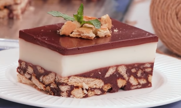 U mleko na šporetu dodajte šećer, maslac, kakao, sve izmešajte pa prelijte preko izmrvljenih keksi, promešajte, pa stavite u kalup ili na tacnu i ostavite u fližideru da se hladi 20 minuta. Mleko pomešajte sa šećerom, brašnom, skrobom, maslacem i esencijom vanile, promešajte sve i kuvajte, pa takoprelijte preko keksa i ostavite ponovo da se hladi 20 minuta. Zatim mleku na šporetu dodajte šećer, skrob, kakao, čokoladu, maslac, aromu vanile i uz mešanje kuvajte, pa sipajte u kalup preko belog fila i ostavite da se hladi sat vremena.
