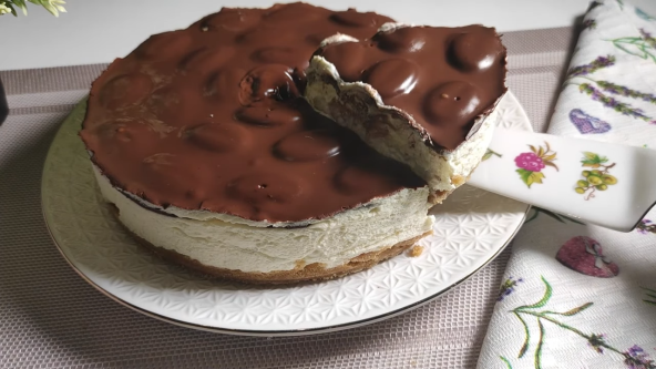U mleveni keks dodajte rastopljen puter i kašiku pavlake pa sve sjedinite i utisnite u kalup. Stavite u frižider dok pripremate fil. Umutite krem sir sa puterom sobne temperature. Otopite belu čokoladu pa i nju umešajte. Posebno umutite 120 gr slatke pavlake pa umešajte u prethodnu smesu. Sada fil stavite preko korice od keksa. Preko fila možete, po želji, staviti mini čajne čokoladne keksiće. stavite u frižider na 3h. Otopite crnu čokoladu pa dodajte toplu slatku pavlaku. Dobro promešajte pa prelijte preko keksića. Stavite još malo u frižider pa secite i sladite se.