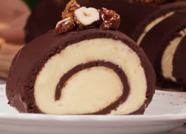 Pomešajte mlevenu plazmu i nutelu i dobro sjedinite. Rasporedite na providnoj foliji u obliku pravougaonika. U mleko dodajte oba šećera, puding i kuvajte dok se ne zgusne uz konstatno mešanje. Pokrijte i ohladite, pa dodajte maskarpone i mikserom sve lepo sjedinite. Premažite preko keska i urolajte. Ostavite u frižideru sat vremena. Prelijte istopljenom čokoladom. Istopite šećer, pa dodajte lešnike. Sipajte na pek papir i ostavite da se ohladi. isecite i poređajte po rolatu.