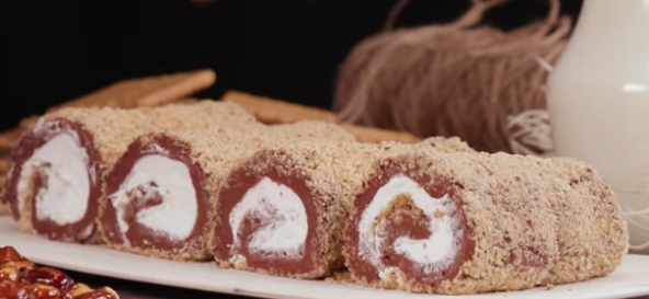 Mleveni keks pomešajte sa mlevenim lešnicima (100 g) i pospite po dnu kalupa. U mleko sipajte brašno i šečer koji ste prethodno sjedinili i kuvajte dok se ne zgusne, uz konstatno mešanje. Sklonite sa šporeta, pa dodajte puter i mešajte dok se ne istopi. Zatim sipajte kakao i nutelu, pa promešajte. Sipajte preko keksa i lešnika i poravnajte. Umutite slatku pavlaku i sipajte preko čokoladnog fila. Poravnajte i stavite u frižider na pola sata. Izvadite, isecite, pa pospite mlevenim lešnicima (50 g), pa svako parče urolajte. Ukrasite karamelizovanim lešnicima ako želite.